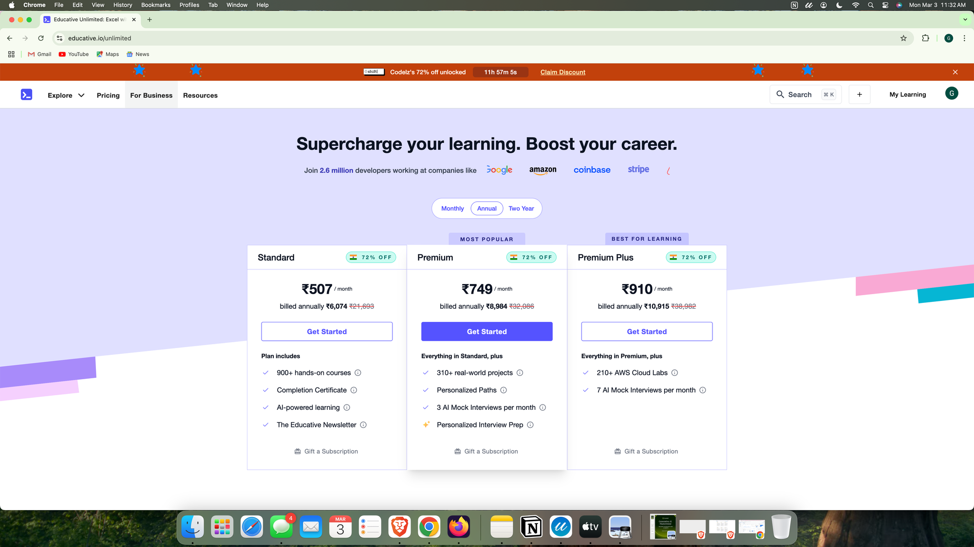 Learn to code, grow your skills, and succeed in your tech interview. They have 3 pricing plans. All plans come with full access to all courses.