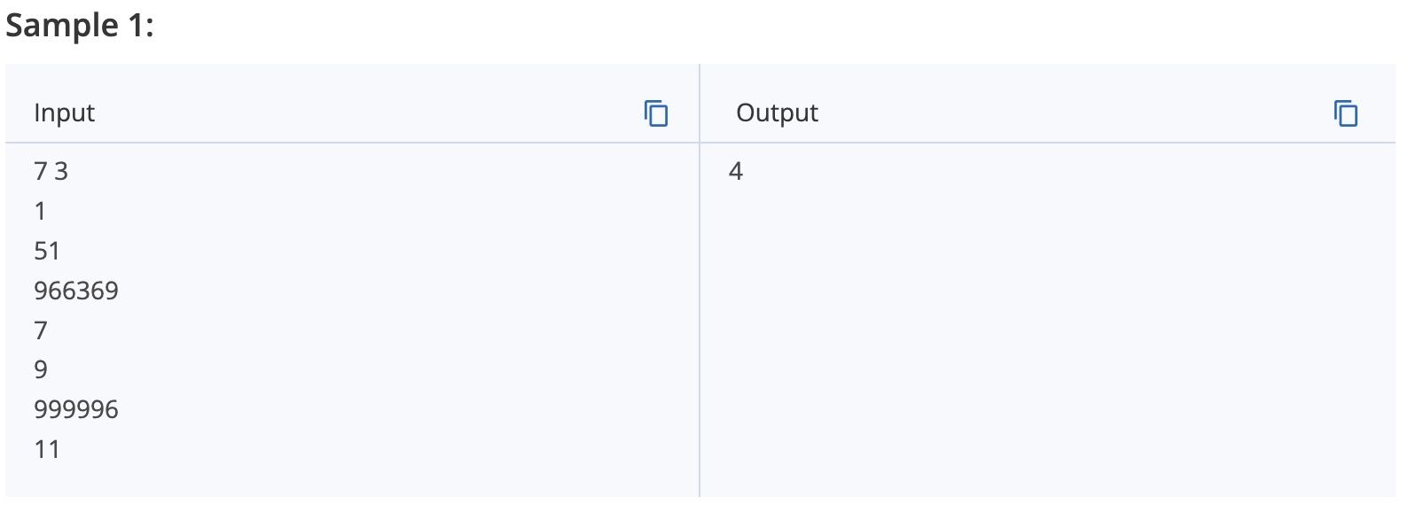 The input begins with two positive integers N, K. The next N lines contain one positive integer each denoted by Ai.